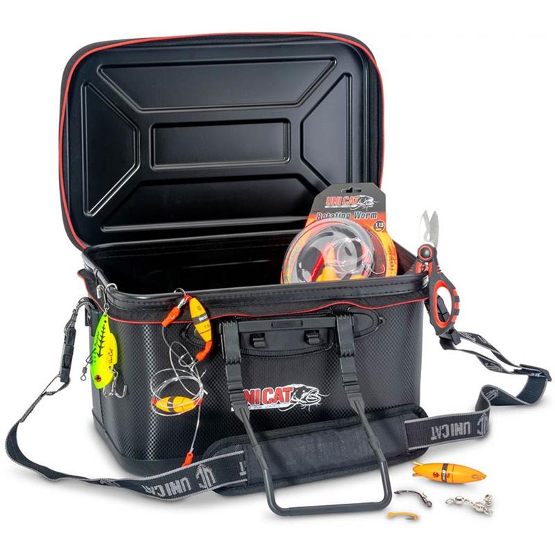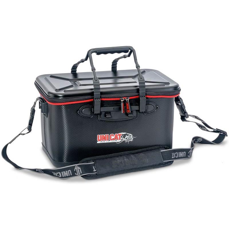 Bakkan Unicat entièrement imperméable et résistante aux chocs, qui se distingue non seulement sur le plan fonctionnel, mais aussi sur le plan visuel grâce à sa finition moderne en carbone tressé. Le couvercle à coque dure n’est rien d’autre qu’une table fonctionnelle pour ranger le matériel de pêche du silure. Le sac est fourni avec une solide sangle de transport, des poignées robustes et un revêtement en caoutchouc antidérapant sur le fond, ce qui le rend particulièrement intéressant pour les pêcheurs en bateau.