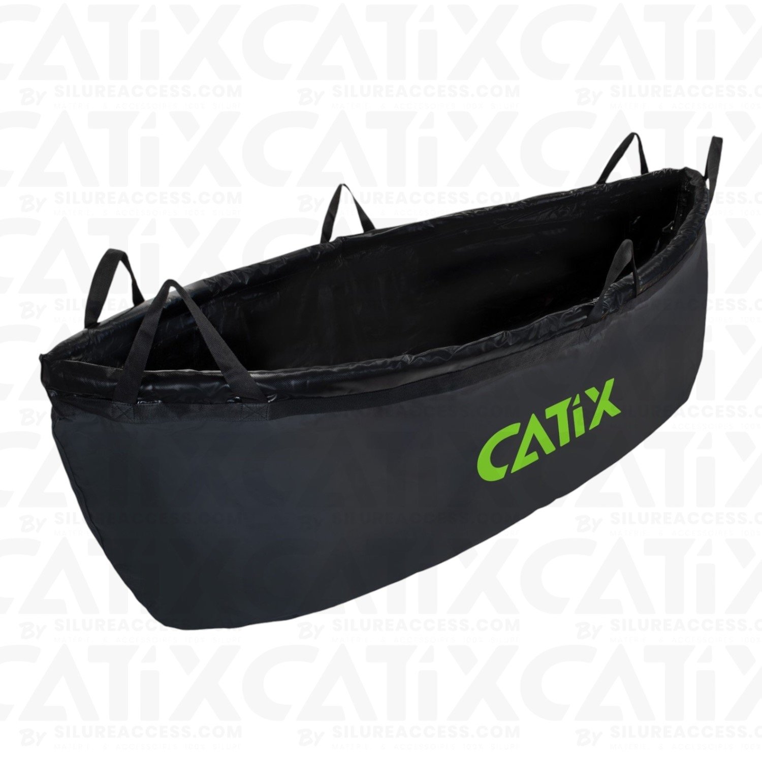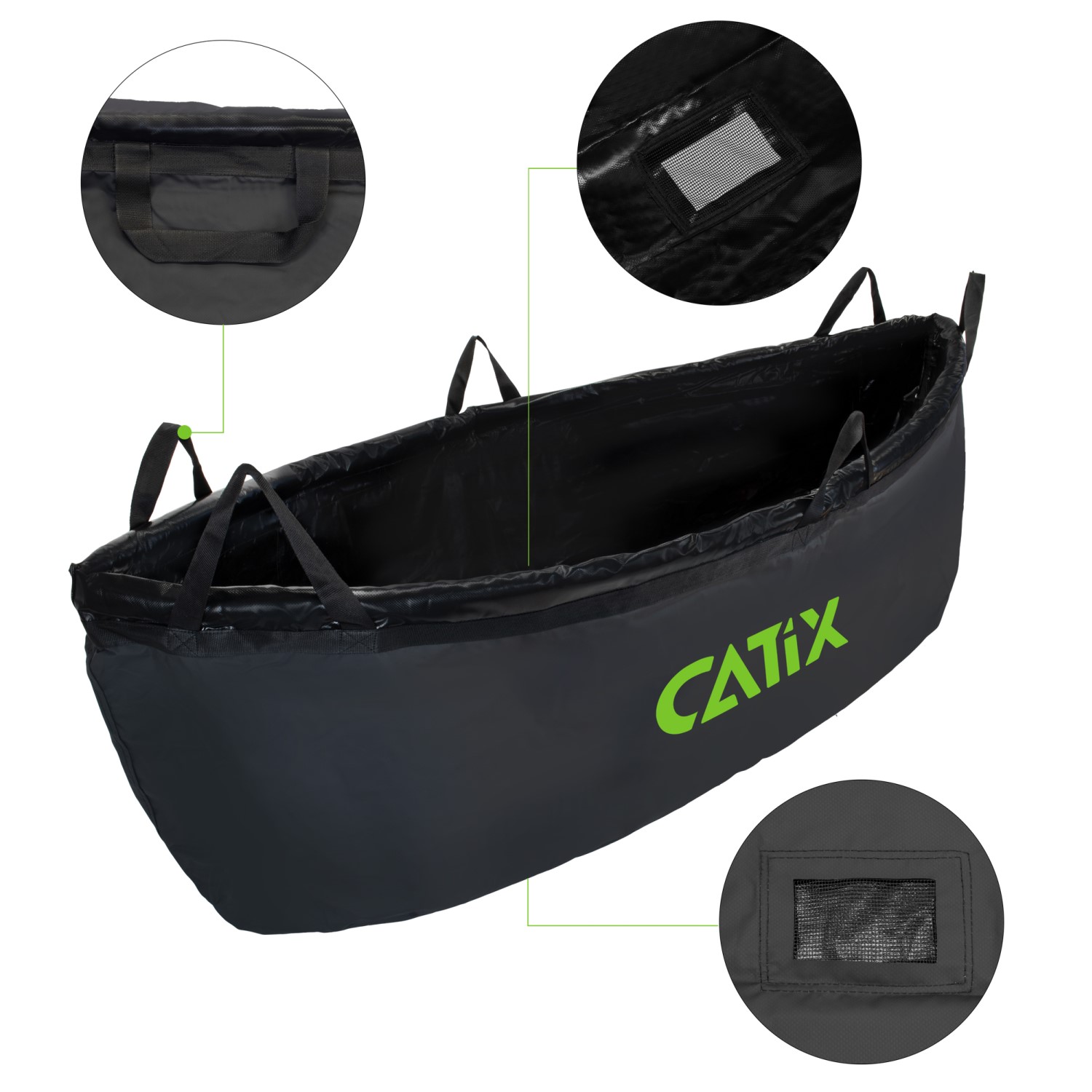 Le tapis de pesée et de transport spécial pour les pêcheurs de silure. Six sangles de transport permettent de transporter les gros silures en toute sécurité et de manière à protéger les poissons en terrain difficile. Le poisson repose en toute sécurité dans le sac de transport, est protégé contre tout glissement et peut être transporté par deux pêcheurs. Le Catix Weigh Sling est très fiable pour peser les poissons de la classe des 100 kilos en douceur et rapidement. Des évacuations d’eau spéciales en matériau maillé doux pour les muqueuses sont cousues sous le tapis. Les pêcheurs en bateau en particulier peuvent utiliser le Weigh Sling pour mettre les poissons directement à bord et protéger l’intérieur du bateau de la saleté et du mucus.